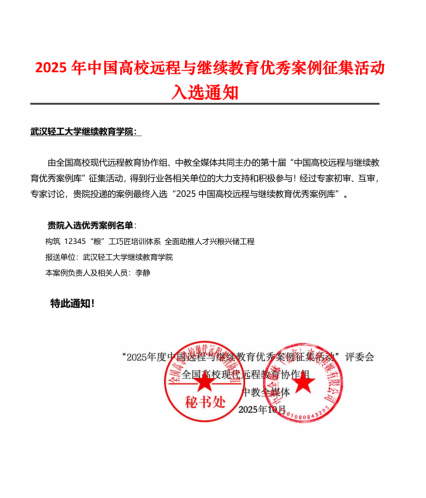 近日,由全国高校现代远程教育协作组与中教全媒体联合主办的第十届“中国高校远程与继续教育优秀案例库”征集活动评选结果揭晓。武汉轻工大学继续教育学院报送的案例《构筑12345“粮”工巧匠培训体系 全面助推人才兴粮兴储工程》经过多轮严格评审,最终成功入选“2025中国高校远程与继续教育优秀案例库”。