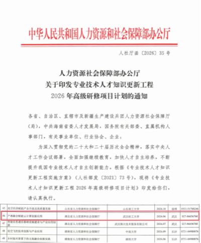 近日,人力资源社会保障部办公厅印发《专业技术人才知识更新工程2026年高级研修项目计划》(人社厅函〔2026〕35号),我校申报的“产教融合赋能云计算创新应用”高级研修项目成功获批国家级自筹经费项目。这是我校首次获得该工程高级研修项目资质,在高层次专业技术人才培训领域实现国家级项目零的突破。