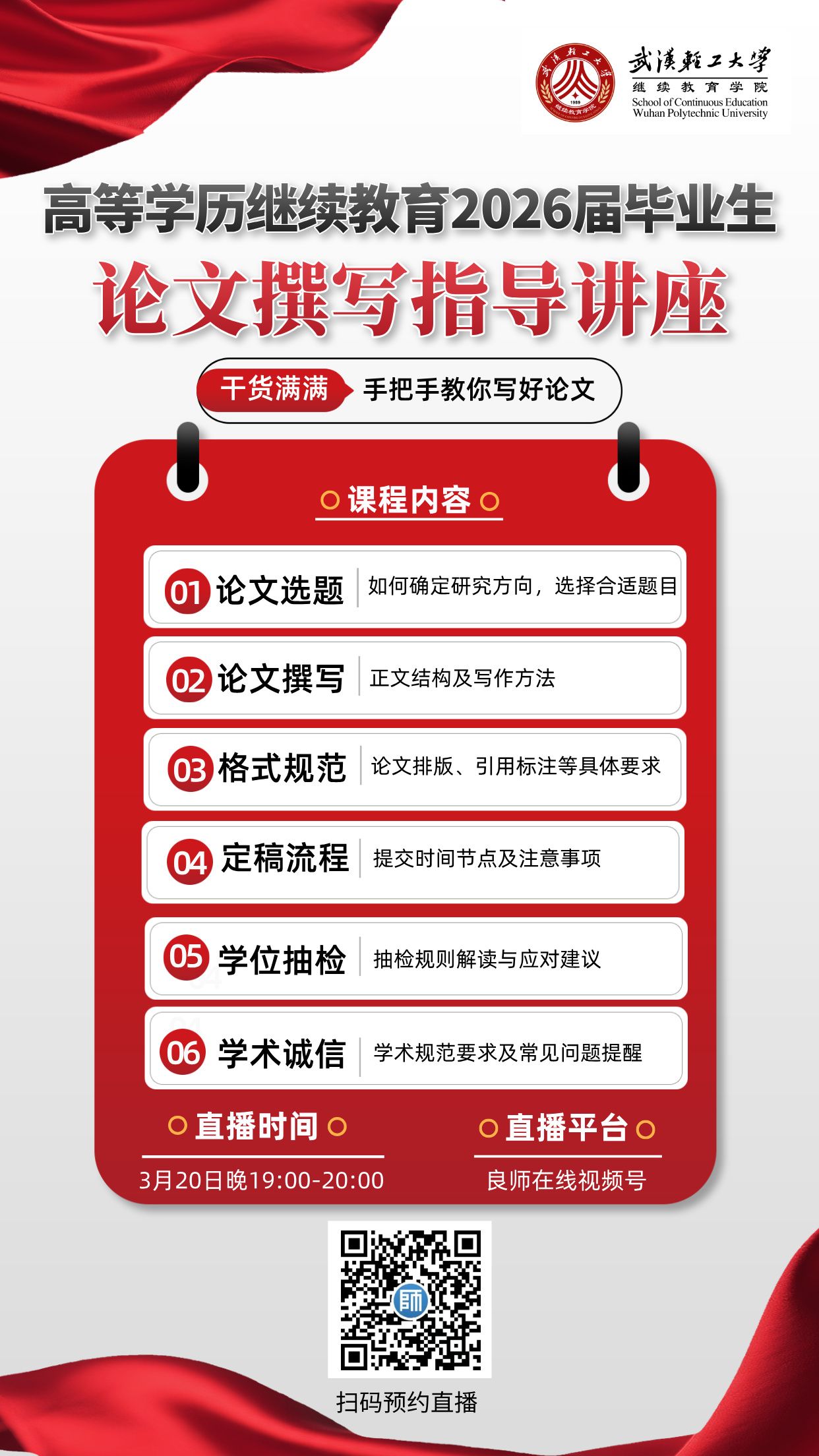 毕业论文是本科人才培养的重要环节,是学生毕业资格审定的核心依据。为切实提升我院2026届高等学历继续教育本科毕业生的论文写作能力,规范论文撰写流程,确保毕业论文质量,学院决定举办毕业论文撰写线上指导讲座。现将有关事项通知如下:
